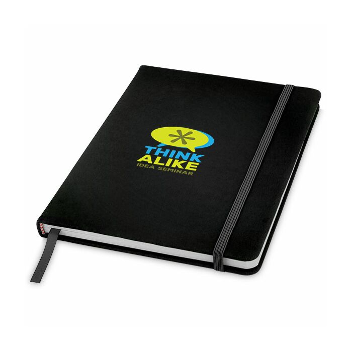 Hard cover with matching colour elastic closure band and ribbon marker